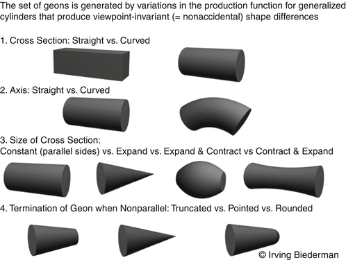 According to this theory the visual system recognizes objects by decomposing them into two-dimensional or three-dimensional geometric primitives termed geons The geons are a partition of the set of generalized cylinders or volumes created by sweeping a cross-section along an axis into shapes that differ in nonaccidental properties. Biedermans theory stating that we recognize objects by first identifying the geons that correspond to their subobjects. - pop-out following practice not consistent with feature maps unless new maps can be developedold maps can be altered.